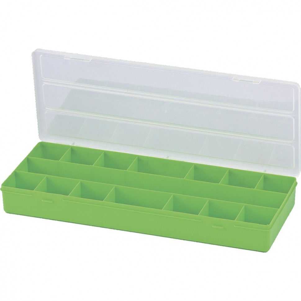 Универсальный бокс Сибртех 90732 размером 382 х 152 х 45 мм используется для хранения и транспортировки мелочей. В него можно положить украшения, снасти, крепежные элементы, канцтовары и др. Контейнер позволит сэкономить пространство, а также упорядочить вещи для более удобного поиска. За счет компактных размеров блок легко поместится в ящике с инструментами, комоде или на столе. ПреимуществаПолипропиленовый бокс надежно защищает содержимое от пыли и брызг воды. Бокс оснащен 15 большими и маленькими секциями для хранения вещей разного размера и формы. Благодаря прозрачной крышке содержимое блока можно увидеть без ее открытия.