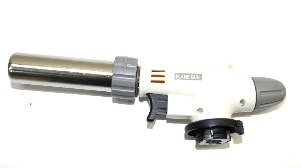 Горелка разборной конструкции и состоит из пластикового корпуса, мундштука, оснащена пьезоподжигом, регулировкой пламени.