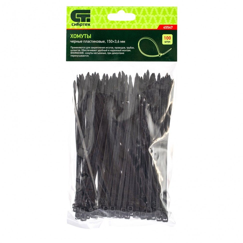 Черные пластиковые хомуты Сибртех 45547, 150 х 3,6 мм, 100 шт. в упаковке, используются для стяжки кабелей, закрепления трубок, шлангов, рекламных конструкций, а также для упаковки различных предметов. Пригодятся во время прокладки электрических и локальных вычислительных сетей, ремонта компьютерной техники, оформлении торговых стендов, комплектовании товара, будут также полезны дома, на даче и в гараже. ПреимуществаНадежные соединения — кабельные стяжки изготовлены из прочного нейлона. Возможность проведения наружных работ — хомуты устойчивы к ультрафиолету и сохраняют свои свойства при температуре от -35 до +85 ℃. 100 штук в упаковке — набора хватит надолго.