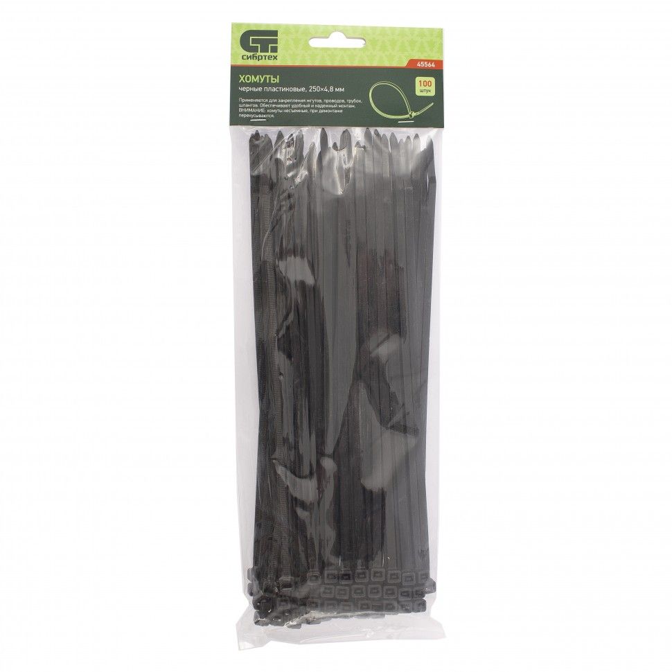 Черные пластиковые хомуты Сибртех 45564, 250 х 4,8 мм, 100 шт. в упаковке, используются для стяжки кабелей, закрепления трубок, шлангов, рекламных конструкций, а также для упаковки различных предметов. Пригодятся во время прокладки электрических и локальных вычислительных сетей, ремонта компьютерной техники, оформлении торговых стендов, комплектовании товара, будут также полезны дома, на даче и в гараже. ПреимуществаНадежные соединения — кабельные стяжки изготовлены из прочного нейлона. Возможность проведения наружных работ — хомуты устойчивы к ультрафиолету и сохраняют свои свойства при температуре от -35 до +85 ℃. 100 штук в упаковке — набора хватит надолго.