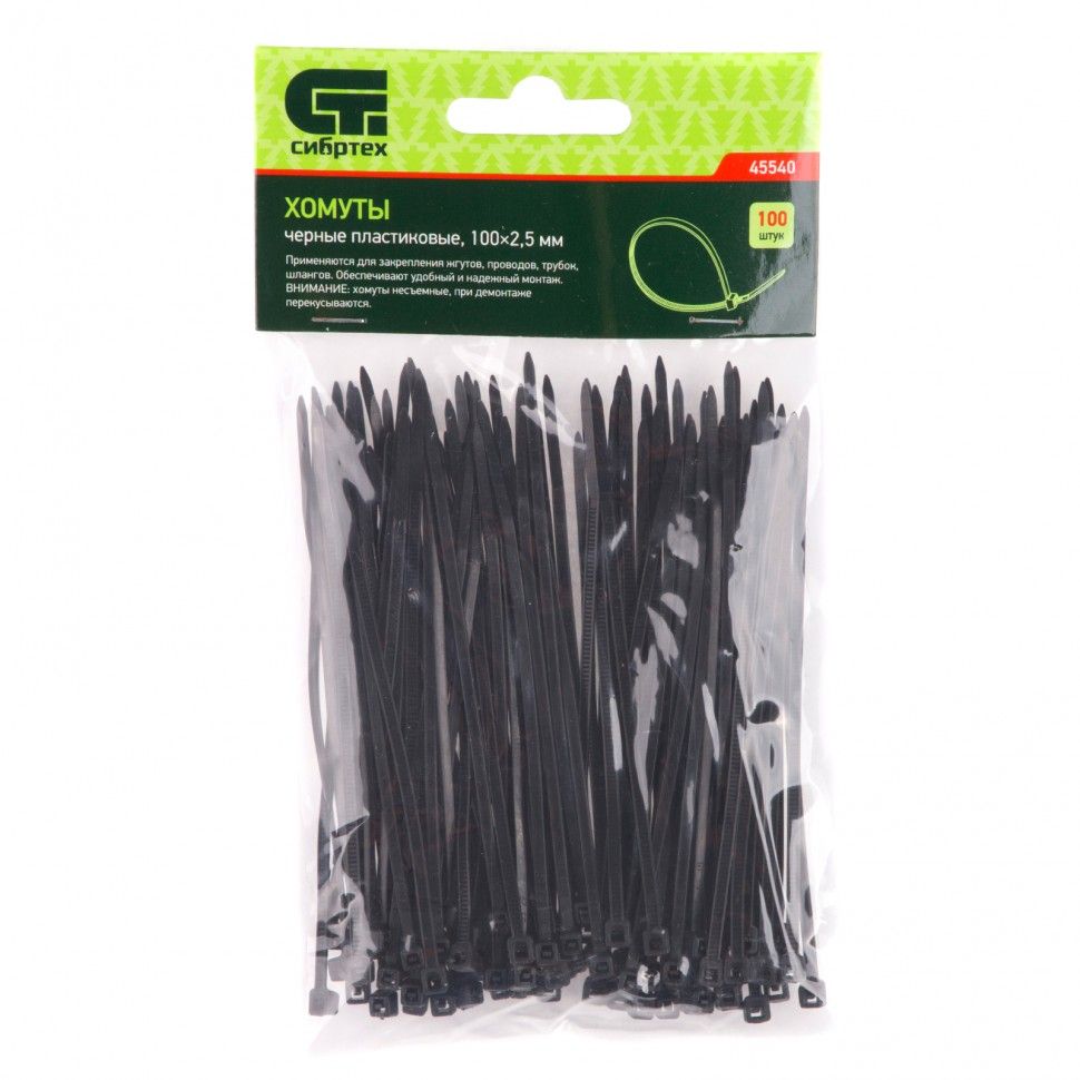 Черные пластиковые хомуты Сибртех 45540, 100 х 2,5 мм, 100 шт. в упаковке, используются для стяжки кабелей, закрепления трубок, шлангов, рекламных конструкций, а также для упаковки различных предметов. Пригодятся во время прокладки электрических и локальных вычислительных сетей, ремонта компьютерной техники, оформлении торговых стендов, комплектовании товара, будут также полезны дома, на даче и в гараже. ПреимуществаНадежные соединения — кабельные стяжки изготовлены из прочного нейлона. Возможность проведения наружных работ — хомуты устойчивы к ультрафиолету и сохраняют свои свойства при температуре от -35 до +85 ℃. 100 штук в упаковке — набора хватит надолго.