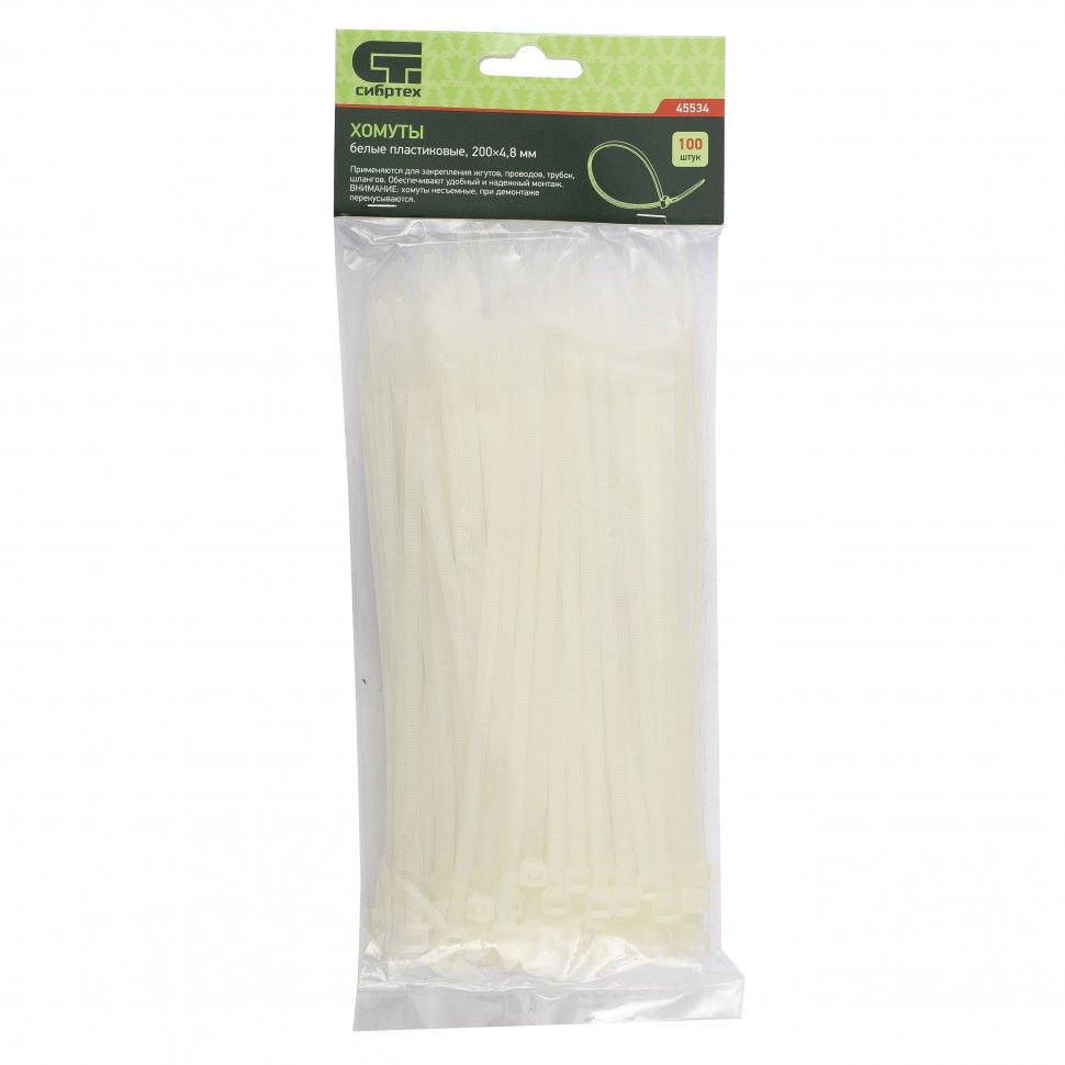 Белые пластиковые хомуты Сибртех 45534, 200 х 4,8 мм, 100 шт. в упаковке, используются для стяжки кабелей, закрепления трубок, шлангов, рекламных конструкций, а также для упаковки различных предметов. Пригодятся во время прокладки электрических и локальных вычислительных сетей, ремонта компьютерной техники, оформлении торговых стендов, комплектовании товара, будут также полезны дома, на даче и в гараже. ПреимуществаНадежные соединения — кабельные стяжки изготовлены из прочного нейлона. Возможность проведения наружных работ — хомуты устойчивы к ультрафиолету и сохраняют свои свойства при температуре от -35 до +85 ℃. 100 штук в упаковке — набора хватит надолго.
