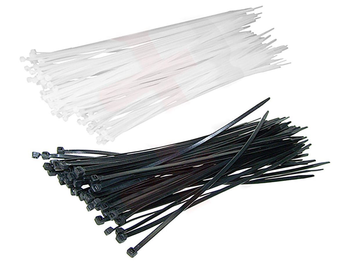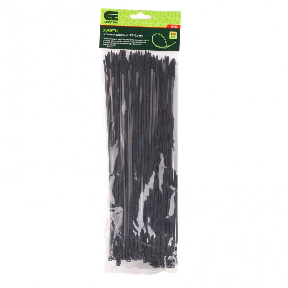 Черные пластиковые хомуты Сибртех 45560, 300 х 3,6 мм, 100 шт. в упаковке, используются для стяжки кабелей, закрепления трубок, шлангов, рекламных конструкций, а также для упаковки различных предметов. Пригодятся во время прокладки электрических и локальных вычислительных сетей, ремонта компьютерной техники, оформлении торговых стендов, комплектовании товара, будут также полезны дома, на даче и в гараже. ПреимуществаНадежные соединения — кабельные стяжки изготовлены из прочного нейлона. Возможность проведения наружных работ — хомуты устойчивы к ультрафиолету и сохраняют свои свойства при температуре от -35 до +85 ℃. 100 штук в упаковке — набора хватит надолго.