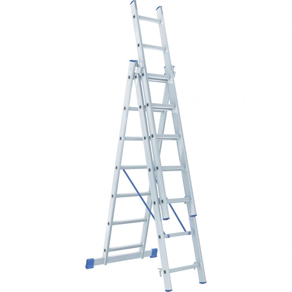 Алюминиевая трехсекционная лестница Сибртех 97817 состоит из 3 секций по 7 ступеней каждая. Она предназначена для использования преимущественно на открытом воздухе и в помещениях с высокими потолками, подойдет также для работников коммунальных служб и строителей. Лестница поможет провести отделочные, монтажные работы, будет полезна на складе. ПреимуществаНадежность и долговечность — рама изготовлена из прессованного алюминиевого профиля прямоугольного сечения, весит намного меньше стальных аналогов, при этом обладает прочностью и коррозионной стойкостью. Допустимая нагрузка 150 кг — лестница способна выдержать вес практически любого пользователя. Многофункциональность — лестница может использоваться в 3 различных вариациях — в качестве стремянки (с двумя расставленными и одной выдвинутой вверх секцией), двухсторонней стремянки (две секции расставлены, третья демонтирована) и приставной лестницы. Пластиковые заглушки — края профиля не царапают напольное покрытие независимо от выбранного положения лестницы. Устойчивость — лестница оснащена съемным стабилизатором, выравнивающим ее положение на горизонтальных поверхностях. Безопасная эксплуатация — на ступени нанесено антискользящее покрытие, имеется ограничитель по максимальной высоте. Простое применение — сборка, разборка и смена рабочих положений не занимает много времени. Компактное хранение и удобная транспортировка — в сложенном виде лестница не занимает много места. Внешний вид товара может незначительно отличаться от указанного на изображении, что не влечет изменения его качества.