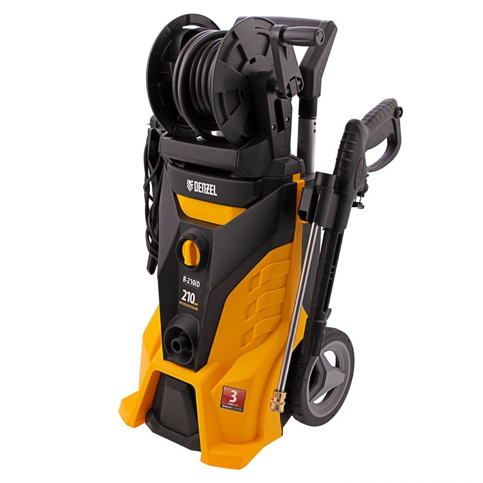 Моечная машина высокого давления Denzel R-210iD с асинхронным двигателем и барабаном для шланга оптимально подходит для очищения автомобилей, заборов, дорожек и садового инвентаря. Эффективно справляться с серьезными загрязнениями позволяют мощный мотор 2600 Вт и помпа с производительностью 8 л/мин и максимальным давлением 210 бар. ,Отсутствие водопровода поблизости не станет проблемой. Мойка с насосом может производить забор воды из любых емкостей благодаря функции самовсасывания, при этом теряя не более 5% давления. Алюминиевая помпа со стальными плунжерами отличается высокой точностью подгонки деталей, что обеспечивает надежность и стабильное давление на выходе. Преимущества Термозащита — автоматическое отключение при риске перегрева исключает поломку двигателя. Работа в труднодоступных местах — быстросъемные форсунки позволяют подобрать оптимальный режим, а насадка-удлинитель — мыть рельефные поверхности. Надежная конструкция — металлические штуцеры выдерживают даже сильные рывки шланга. Быстрое подключение — HPC коннектор в комплекте позволяет легко подсоединять шланг к патрубку мойки. Подготовка к работе за несколько секунд — быстросъёмный коннектор пистолета позволяет подключить шланг одним движением. Защита от случайного пуска — блокировка рычага пистолета позволяет включать автомойку только при полной готовности к работе. Комфортная работа — оптимальная длина сетевого кабеля 5 м и увеличенная длина шланга 8 м предотвращают их натяжение, а катушка с ручкой позволяет избежать запутывание шланга и быстро намотать его. Внешний пенокомплект — можно нанести на поверхности моющий раствор для лучшей борьбы с загрязнениями. Очищение всасываемой воды — надежный фильтр исключает риск засора и продлевают срок службы помпы. Мобильность — колеса и телескопическая ручка позволяют легко перемещать мойку во время работы. Степень защиты IPX5 — исключено прямое попадание внутрь корпуса воды с любого направления при давлении не более 30 кПа. Безопасность — техника отличается изоляцией токопроводящих элементов и защитным заземлением (класс защиты I). Удобное хранение — мойка оснащена держателем пистолета и кронштейном под кабель. Гарантия 3 года — качество инструмента подтверждено производителем.