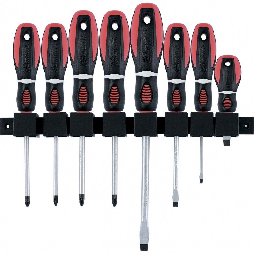 Набор Matrix «Era» 13380 включает в себя 8 отверток из стали CrV, с 3-компонентными рукоятками. Используется для закручивания и откручивания резьбового крепежа со шлицами PH и SL. Направлять отвертку с насаженным крепежом можно одной рукой, т. к. рабочая часть каждого инструмента намагничена. Набор рекомендован для профессионального применения и будет полезен во время ремонта оборудования и бытовой техники, а также при сборке мебели. ПреимуществаПрочность и долговечность — стержни изготовлены из хромованадиевой стали. Износостойкость — рабочие части закалены до высокой твердости 50-56 HRC. Антикоррозийная защита — поверхность стержней хромирована, а наконечники фосфатированы. Комфортная работа — эргономичные трехкомпонентные рукоятки с насечками на подпальцевых выемках обеспечивают надежный захват. Удобное хранение — отвертки поставляются в комплекте с пластиковой подвесной полкой.