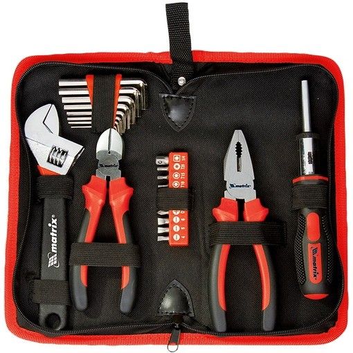 Слесарно-монтажный набор Matrix 13561, 22 предмета, оптимально подходит для бытового и профессионального использования. Универсальный набор содержит ключи-шестигранники для удобства работы в труднодоступных местах, разводной ключ для монтажа/демонтажа болтов и гаек, реверсивную отвертку с битами и переходником для работы с крепежными элементами, бокорезы и плоскогубцы для зажима и сгибания заготовок. ПреимуществаИнструменты выполнены из инструментальной стали, рабочие части закалены, что придает набору необходимые прочностные характеристики. За счет двухкомпонентных рукояток бокорезы, плоскогубцы и отвертка надежно лежат в руке и не проскальзывают, ограничительные упоры обеспечивают безопасную работу. Набор упакован в тканевый пенал на молнии, поэтому при транспортировке и хранении комплектующие не потеряются.