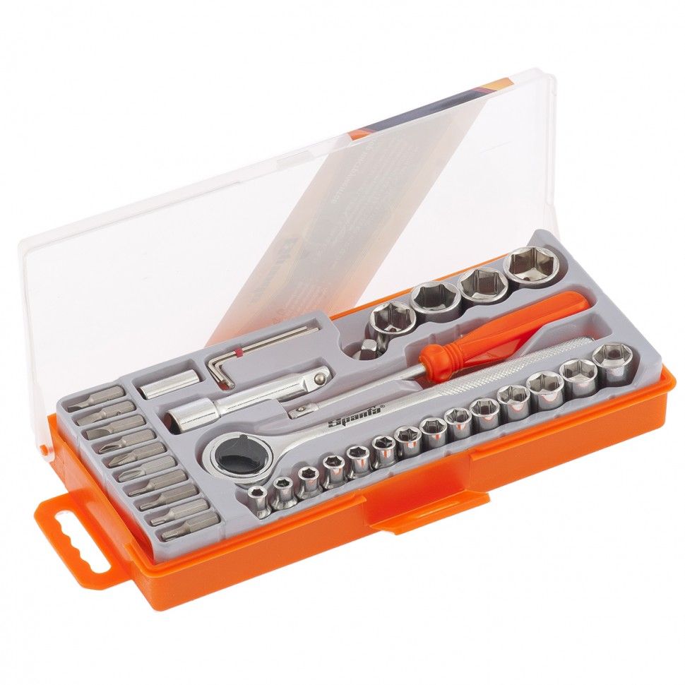 Набор Sparta 13541 содержит 37 предметов для проведения слесарно-монтажных работ. Он оптимально подходит для бытового применения, будет полезен начинающим мастерам. С помощью набора осуществляется монтаж/демонтаж резьбового крепежа. ПреимуществаИнструменты и сменные насадки выполнены из инструментальной стали и закалены, что обеспечивает им необходимые прочностные характеристики. Широкий ассортимент торцевых головок в наборе позволяет подобрать нужную в зависимости от крепежа. Реверсивная трещотка позволяет осуществлять монтаж и демонтаж резьбовых соединений. В комплект входит пластиковый диск для удобной эксплуатации реверсивной трещотки. Удлинитель на 3/8 дюйма обеспечивает доступ к резьбовым соединениям в труднодоступных местах. Ярко-оранжевый кейс с прозрачной крышкой позволяет удобно хранить и транспортировать набор, он не потеряется среди инструментов.