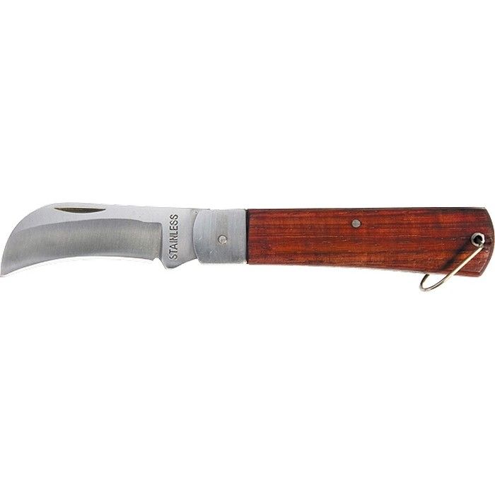 Складной нож Sparta 78999 с загнутым лезвием и деревянной ручкой эффективно справляется с резкой резиновых, кожаных, картонных изделий и напольных покрытий. За счет своей универсальности он будет полезен профессиональным и частным мастерам, туристам, любителям отдыха на природе. ПреимуществаОстрозаточенное лезвие из нержавеющей высококачественной стали 3Hr13 обладает высокой износостойкостью и прочностью. Деревянная ручка не скользит в руке и приятна по тактильным ощущениям, поэтому с ножом комфортно работать. Складной нож весом 133 г удобен в использовании и транспортировке.