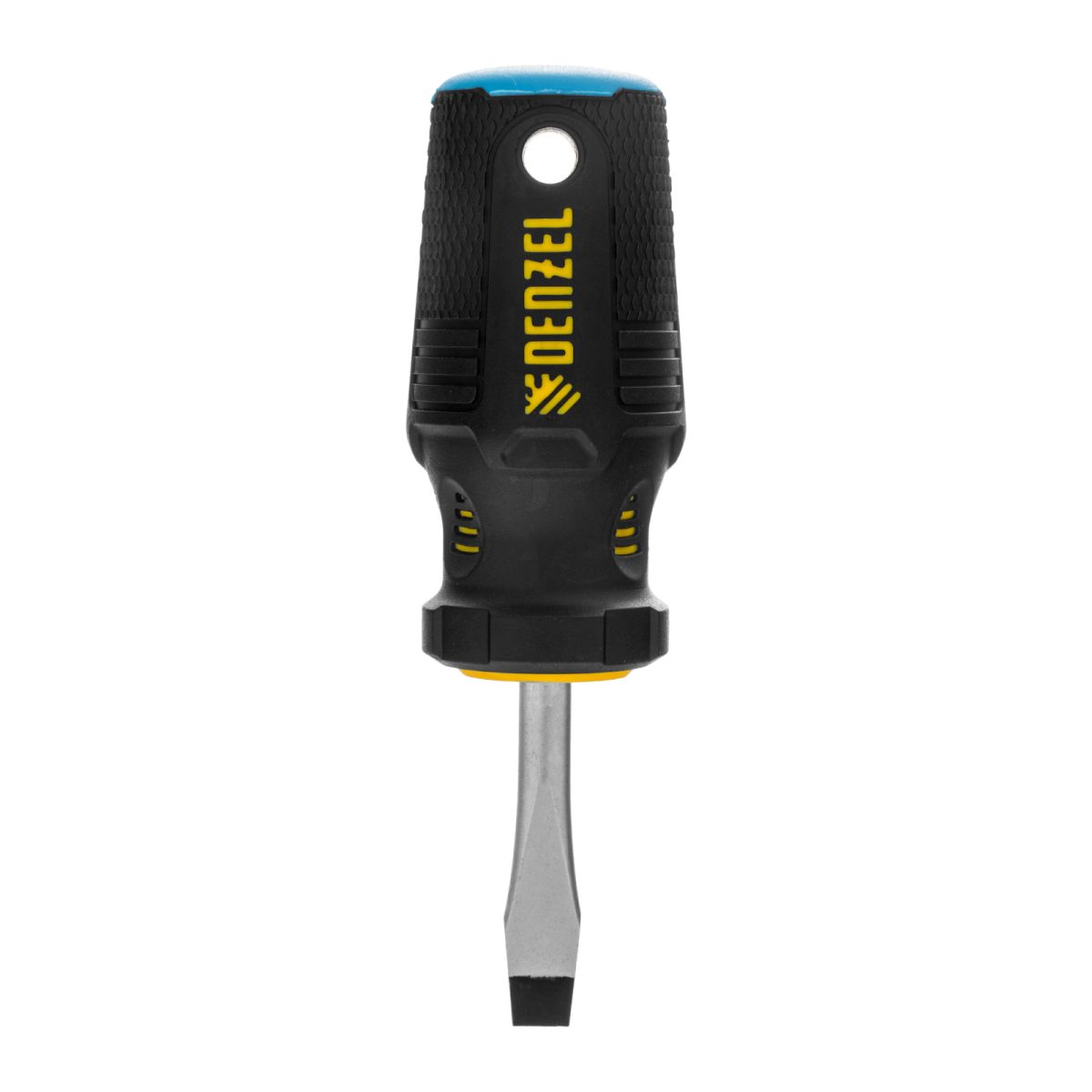 Отвертка Denzel 122017 с трехкомпонентной рукояткой, со стержнем из стали S2, длиной 38 мм, предназначена для монтажа и демонтажа винтов и саморезов с прямым шлицем SL6. Удобна для работы в ограниченном пространстве. Высокоточный намагниченный шлиц крепко фиксируется в головке крепежа. Отвертка выдерживает интенсивное применение, предназначена для выполнения профессиональных ремонтных и монтажных работ. ПреимуществаПрочность — стержень изготовлен из стали S2 и закален до твердости 61 HRC. Износостойкость и защита от коррозии — шлиц фосфатирован, на стержень нанесено никелевое покрытие. Работа в сложных условиях — трехкомпонентная рукоятка обладает масло- и бензостойкостью. Быстрый поиск нужного инструмента — на затыльнике имеется цветовая маркировка, позволяющая определить типоразмер отвертки. Комфортная эксплуатация без усталости — эргономичная рукоятка с резиновыми вставками и подпальцевыми выемками не выскальзывает из ладони. Удобное хранение — отверстие в рукоятке позволяет подвешивать отвертку на крючок или скобу.
