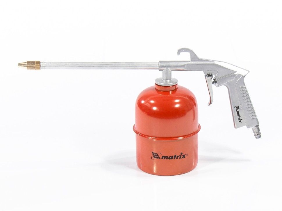 Пистолет моечный пневматический Matrix 57340 предназначен для очищения и обезжиривания различных поверхностей (ковров, мебели, полов, плиток и т. д. ) потоком воды под воздействием сжатого воздуха. Также инструмент подходит для обработки рабочей зоны различными жидкостями, например, для смазывания металлических изделий карбоном или покрытия автомобиля мовилем. Длинный носик обеспечивает работу в самых труднодоступных местах. ПреимуществаМобильность — алюминиевый бачок для жидкости (воды, масла, густого состава) объемом 0,75 л избавляет мастера от необходимости подключения дополнительного шланга. Настраиваемый диаметр сопла — можно регулировать степень распыления и решать различные задачи одним инструментом. Комфортная работа — рукоятка с рельефным покрытием хорошо ложится в руку. Малый вес 780 грамм — мастер может работать длительное время без усталости и перенапряжения рук.