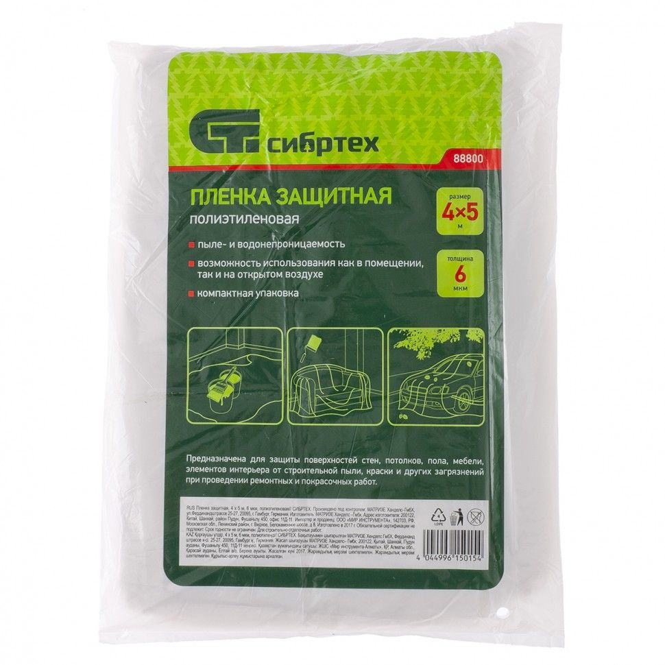 Защитная полиэтиленовая пленка Сибртех 88800 плотностью 6 мкм и размером 4 х 5 м используется для защиты предметов и поверхностей, на которые может попасть пыль или мусор в процессе ремонтно-строительных работ. С ее помощью можно предотвратить загрязнение оконных рам, напольных покрытий, мебели и т. д. ПреимуществаБезопасность для здоровья и окружающей среды — пленка не содержит посторонних примесей. Электростатические свойства — полиэтиленовая пленка легко принимает форму предметов. Долговечность и надежность — прочный материал не рвется при натяжении, не пропускает воду и агрессивные растворы. Универсальность — пленка может использоваться снаружи и внутри помещений. Удобное хранение и транспортировка — изделие продается в компактной упаковке.