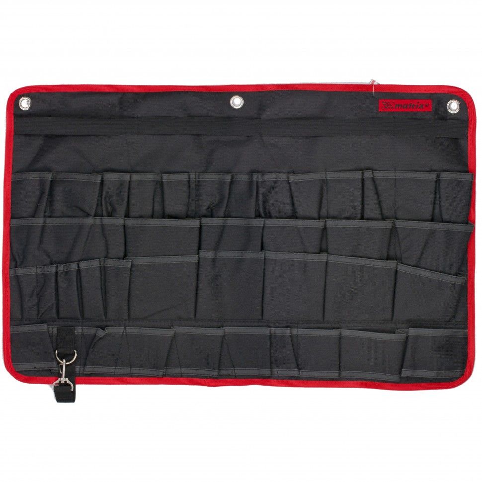 Настенная раскладка для инструмента Matrix 90245 размером 675 х 450 мм предназначена для хранения слесарных, монтажных и других принадлежностей. Благодаря ей все инструменты будут на своих местах и не потеряются. Разместить раскладку очень просто — она вешается на стену при помощи установленных в материале люверсов. Будет полезна дома, на даче и в гараже. ПреимуществаДолговечность и простой уход — раскладка из прочной ткани оксфорд устойчива к износу и легко чистится. Функциональность — в З8 карманах можно разместить инструменты разного размера и формы. Дополнительные возможности — резинка в верхней части удобна для фиксации длинных предметов.