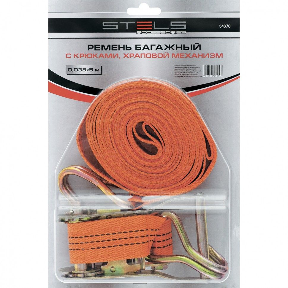 Багажный ремень с крюками Stels 54378 размером 10 х 0,038 м, с храповым механизмом, помогает закрепить груз в открытом багажнике на крыше легковой автомашины или в прицепе. Пригодится для транспортировки различных предметов. ПреимуществаИзносостойкость — ремень изготовлен из прочного полипропилена, крюки из углеродистой стали устойчивы к деформации. Надежная фиксация груза во время движения и маневров автомобиля — допустимая разрывная нагрузка составляет 130 кг, стальные крюки крепко удерживают натянутый ремень. Удобное и быстрое затягивание ленты — ремень снабжен храповым механизмом.