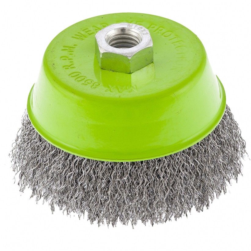 Щетка для УШМ Сибртех «чашка» 746057, М14, диаметром 100 мм, с щетиной из витой проволоки 0,3 мм, предназначена для постепенного снятия тонкого слоя материала с металлических, деревянных и пластиковых поверхностей. Удаляет ржавчину, загрязнения, а также остатки краски и других покрытий. Подходит для обработки участков значительной площади. Щетку устанавливают на вал углошлифовальной машины (УШМ), рекомендуемая максимальная скорость вращения 8500 об/мин. Работать с оснасткой следует в спецодежде. ПреимуществаДеформационная стойкость щетины — витая проволока принимает исходную форму после снятия нагрузок. Защита от коррозии — корпус покрыт эмалью, а на щетину нанесено техническое масло. Быстрая установка и замена насадки — щетка крепится на вал УШМ при помощи гайки М14.