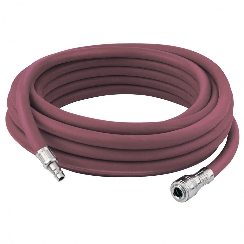 Пневматический армированный резиновый шланг Stels 57021, 10 х 16 мм, длиной 10 м, с быстросъемами, служит для подключения пневматического оборудования к компрессору и выдерживает давление до 24 бар. Изготовлен из резины и армирован капроновой нитью, что обеспечивает высокую устойчивость к механическому воздействию и пережатию, а также к перепадам температур. Может использоваться для прокладки воздушной магистрали. Шланг пригодится на производстве, строительной площадке и в автосервисе. ПреимуществаБыстросъемные соединения типа рапид облегчают подключение шланга к компрессору и пневматическим инструментам. Антикоррозийное никелевое покрытие защищает штуцер и муфту от ржавчины, что увеличивает срок их службы. Длина 10 м обеспечивает мастеру свободное перемещение во время работы. Увеличенная толщина шланга придает ему повышенную прочность.