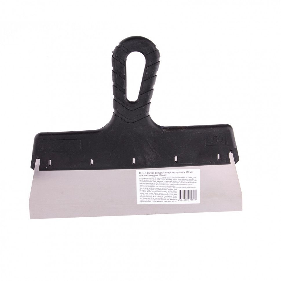 Фасадный шпатель Sparta 85151 с полотном из нержавеющей стали шириной 250 мм и пластмассовой ручкой предназначен для работы со строительными растворами. Используется для их смешивания, нанесения и равномерного распределения по малым или большим поверхностям. ПреимуществаНадежность — рабочее полотно из нержавеющей стали не боится воздействия щелочей и легко выдерживает изгибающие нагрузки. Комфортная эксплуатация — ровное лезвие и наклонная рукоятка облегчают нанесение и выравнивание раствора. Эргономичность — пластмассовая рельефная ручка удобно ложится в руку и не выскальзывает из ладони. Удобное хранение — в рукоятке предусмотрено отверстие для подвешивания шпателя.