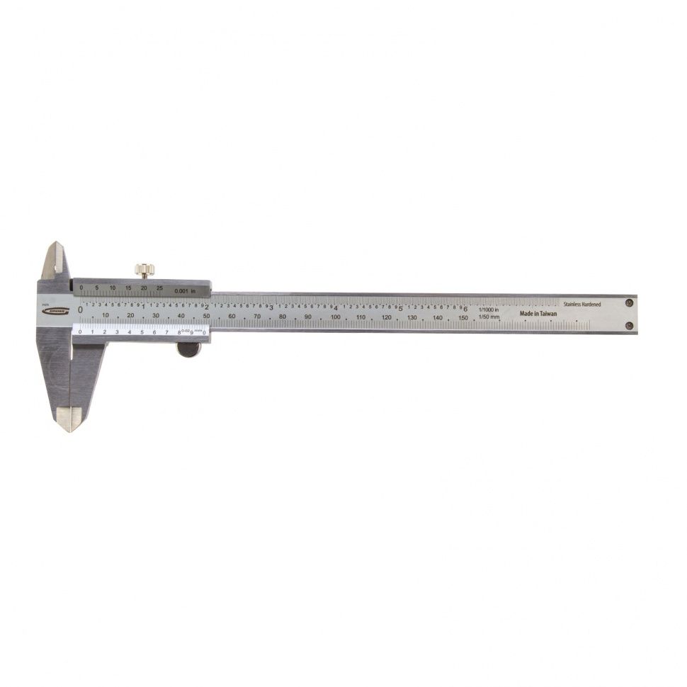 Штангенциркуль Gross 31670 из нержавеющей стали, с глубиномером, предназначен для измерения внутренних и наружных размеров деталей и заготовок в диапазоне 0-150 мм. Значение отсчета по нониусу составляет 0,02 мм. Погрешность находится в пределах ±0,02 мм при измерении до 100 мм, и ±0,03 мм — свыше 100 мм. Инструмент имеет губки двух видов для облегчения замеров внутри и снаружи предметов. Штангенциркуль будет полезен на производственном предприятии, в слесарной и столярной мастерской, автосервисе, а также пригодится в быту. ПреимуществаДолговечность — штангенциркуль выполнен из прочной нержавеющей стали, устойчивой к коррозии. Высокая точность измерений — стопорный винт предотвращает смещение подвижной рамки прибора. Комфортное считывание результатов — шкала штангенциркуля выражена в миллиметрах и дюймах. Дополнительные возможности — благодаря линейке глубиномера штангенциркуль может использоваться для определения глубины отверстий. Удобное хранение и транспортировка — инструмент поставляется в прочном кейсе из ABS-пластика с ложементом.