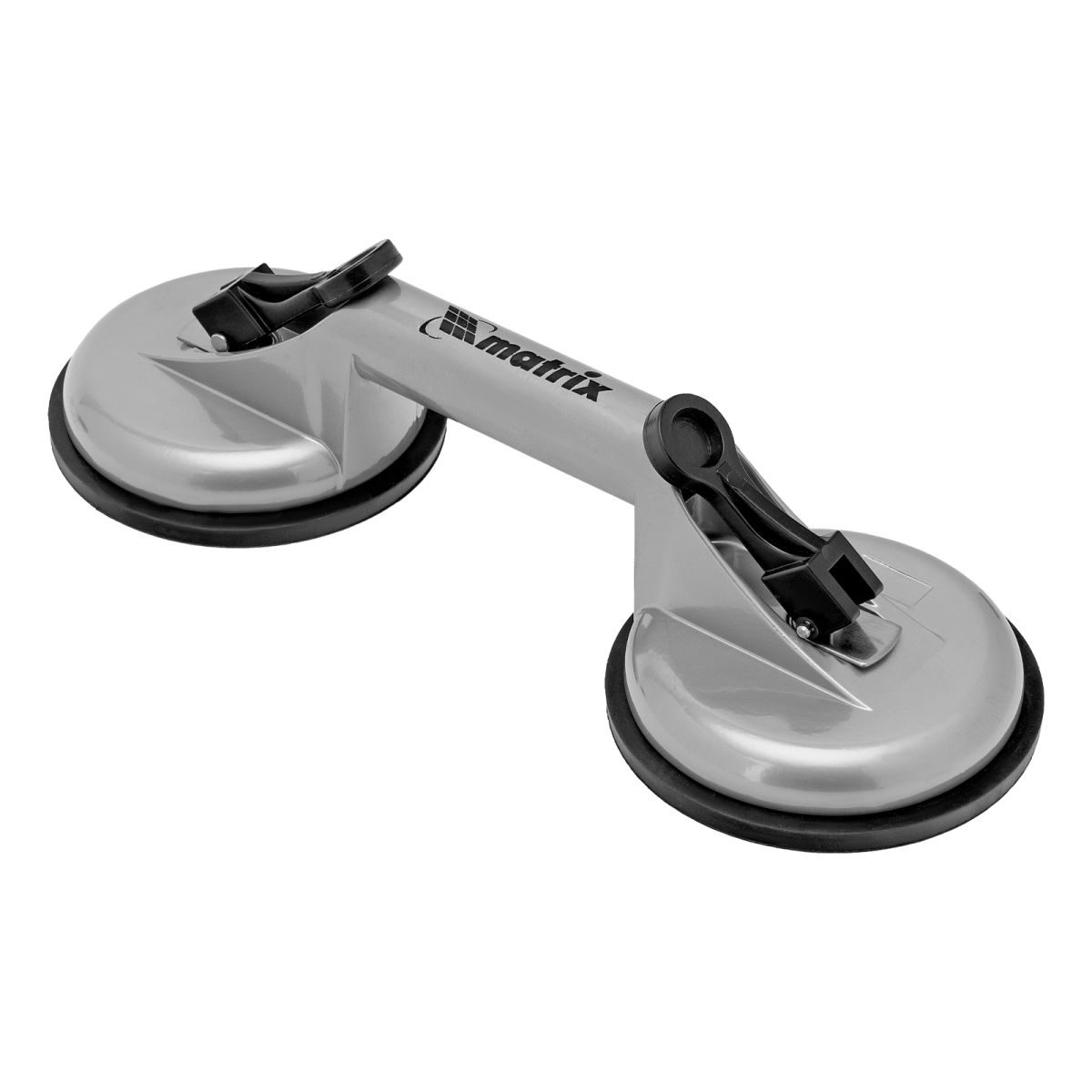 Алюминиевый двойной стеклодомкрат Matrix 875205 позволяет поднимать, переносить и устанавливать стекла, зеркала, плитку, листовой металл и другие гладкие материалы. Имеет две вакуумные присоски, которые бережно и надежно фиксируются на поверхности при помощи зажимов. Стеклодомкрат позволяет длительное время удерживать груз весом до 80 кг. Будет полезен во время строительства, ремонта, а также пригодится в быту. ПреимуществаПрочность — корпус изготовлен из алюминиевого сплава. Долговечность — стеклодомкрат устойчив к коррозии. Эргономичность — удобная рукоятка помогает удерживать груз.