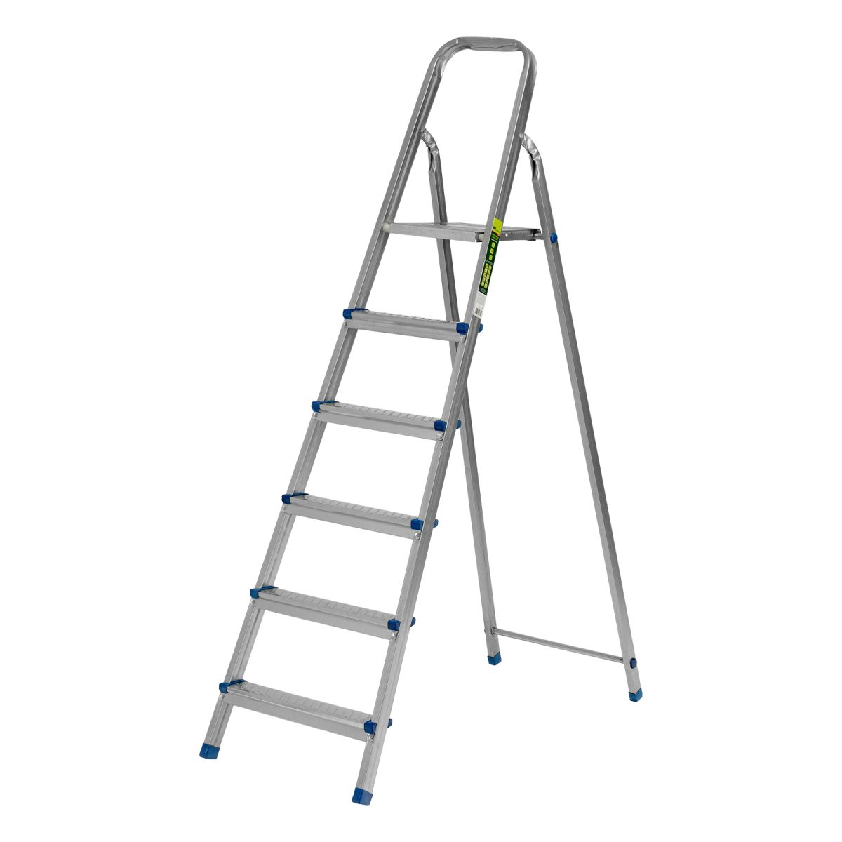 Стальная оцинкованная стремянка Сибртех 97838 с 6 ступенями позволяет повесить полку, картину или шкафчик, достать нужный предмет и решить другие задачи, для которых требуется доступ к предметам на высоте. Рама и ступени из стального профиля выдерживают вес до 120 кг. Расстояние от опорной поверхности до площадки составляет 121 см, при среднем росте пользователя 170 см рабочая высота лестницы — 321 см. Необходимо соблюдать технику безопасности: размещать стремянку только на ровной плоскости и не использовать ее для работы с дрелью, шуруповертом и другим электроинструментом. ПреимуществаПростая установка — на верхней площадке предусмотрены специальные зацепы для фиксации стремянки в разложенном состоянии. Антикоррозийная защита — стальная поверхность оцинкована, что увеличивает срок службы лестницы. Безопасное использование — рифленые ступени обеспечивают противоскользящий эффект, защитные накладки на углах исключают случайное травмирование пользователя. Аккуратное использование — ножки с противоскользящими накладками не повреждают напольное покрытие. Удобная эксплуатация — высокая дуга безопасности позволяет занять устойчивое положение.