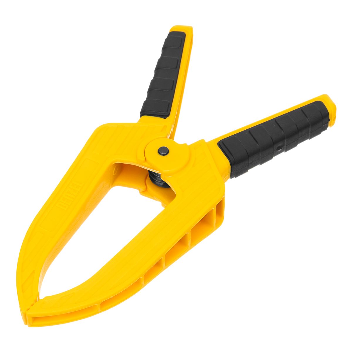 Струбцина клещеобразная удлиненная Denzel 20789 с глубиной зажима 80 мм, с двухкомпонентными рукоятками, способна удерживать детали толщиной до 50 мм. Будет полезна при склеивании или разметке заготовок. Подвижные губки с углублениями на прижимных поверхностях позволяют максимально точно позиционировать деталь при захвате. Струбцина пригодится в столярной мастерской, дома или на даче. ПреимуществаНадежность и долговечность — корпус из ударопрочного пластика усилен ребрами жесткости, поэтому выдерживает значительные нагрузки при сжатии. Надежная фиксация — усиленная пружина позволяет крепко удерживать обрабатываемую деталь. Комфортная работа — двухкомпонентные рукоятки с рельефной поверхностью обеспечивают надежный захват.