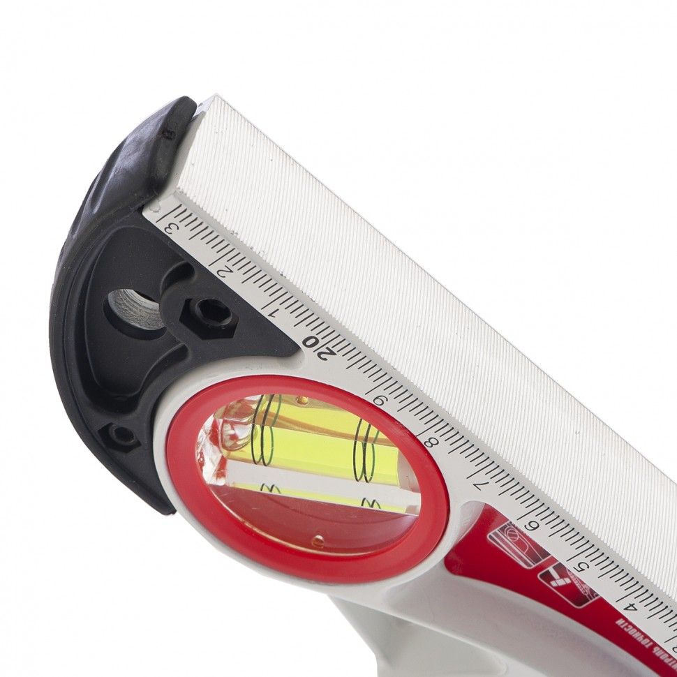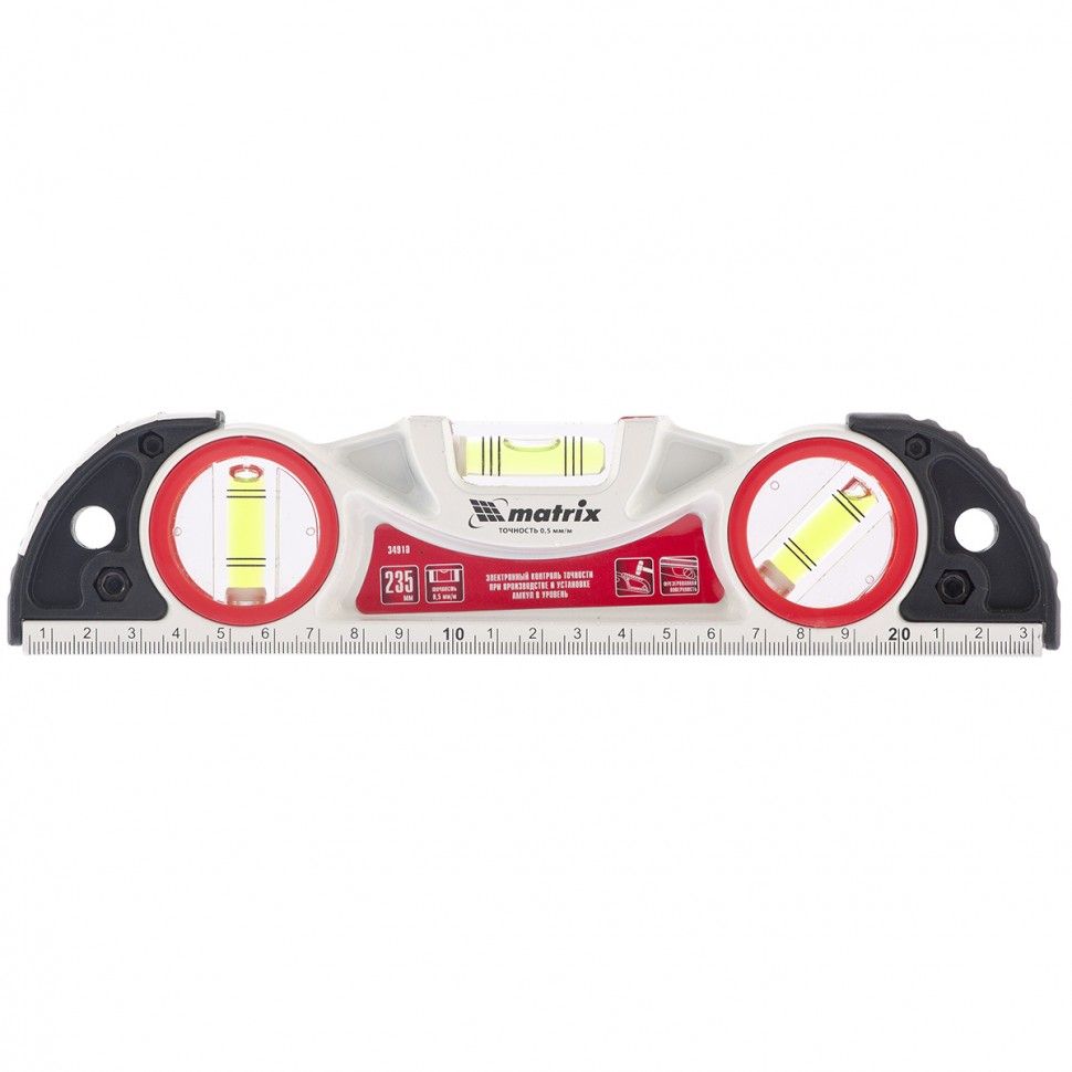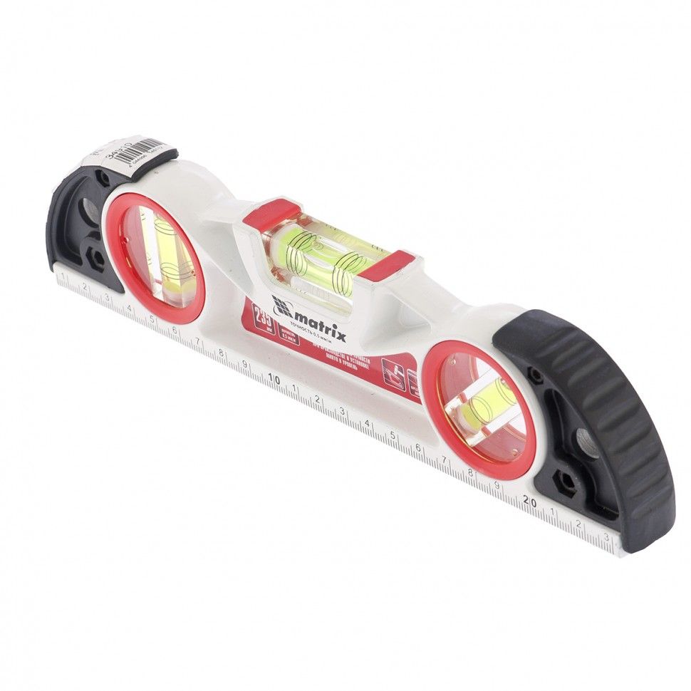 Уровень алюминиевый литой Matrix 34910 длиной 235 мм, с фрезерованной рабочей частью, 3 глазками и двумя ударными площадками, предназначен для проверки поверхностей на отклонение от горизонтали, вертикали и угла 45°. Инструмент значительно повышает точность проводимых работ, пригодится частному мастеру и профессионалу на строительной площадке, во время ремонта и для проведения монтажных работ. ПреимуществаПрочность и коррозионная стойкость — уровень изготовлен из алюминиевого профиля. Точные результаты — пузырьковые ампулы прошли электронную калибровку, нижняя грань фрезерована, что снизило погрешность до 0,5 мм/м. Возможность дополнительного выравнивания материалов — две ударные площадки позволяют наносить удары небольшой резиновой киянкой. Определение расстояний и размеров предметов — на корпусе имеется измерительная шкала. Длина 235 мм — инструментом удобно работать в труднодоступных местах. Для определения отклонения от вертикали 90° необходимо использовать пузырьковую ампулу только в верхнем положении уровня. Только базовая поверхность (противоположная ампуле 180°) является рабочей.