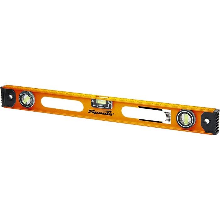 Уровень алюминиевый Sparta «Рельс» 34044 длиной 400 мм имеет 3 глазка, 1 из которых поворотный. С помощью инструмента удобно определять наличие отклонений от горизонтали и вертикали, а также выставлять произвольный угол. ПреимуществаПрочность — корпус выполнен из двутаврового алюминиевого профиля. Защита корпуса — торцевые заглушки повышают ударопрочность и предотвращают попадание внутрь пыли и мелкого мусора. Удобный захват — в корпусе имеется 2 отверстия. Точные результаты — погрешность составляет всего 1 мм/м (0,057°). Дополнительные возможности — измерительная шкала позволяет использовать уровень в качестве линейки. Для определения отклонения вертикали 90° необходимо использовать пузырьковую ампулу только в верхнем положении уровня. Только базовая поверхность (противоположная ампуле 180°) является рабочей.